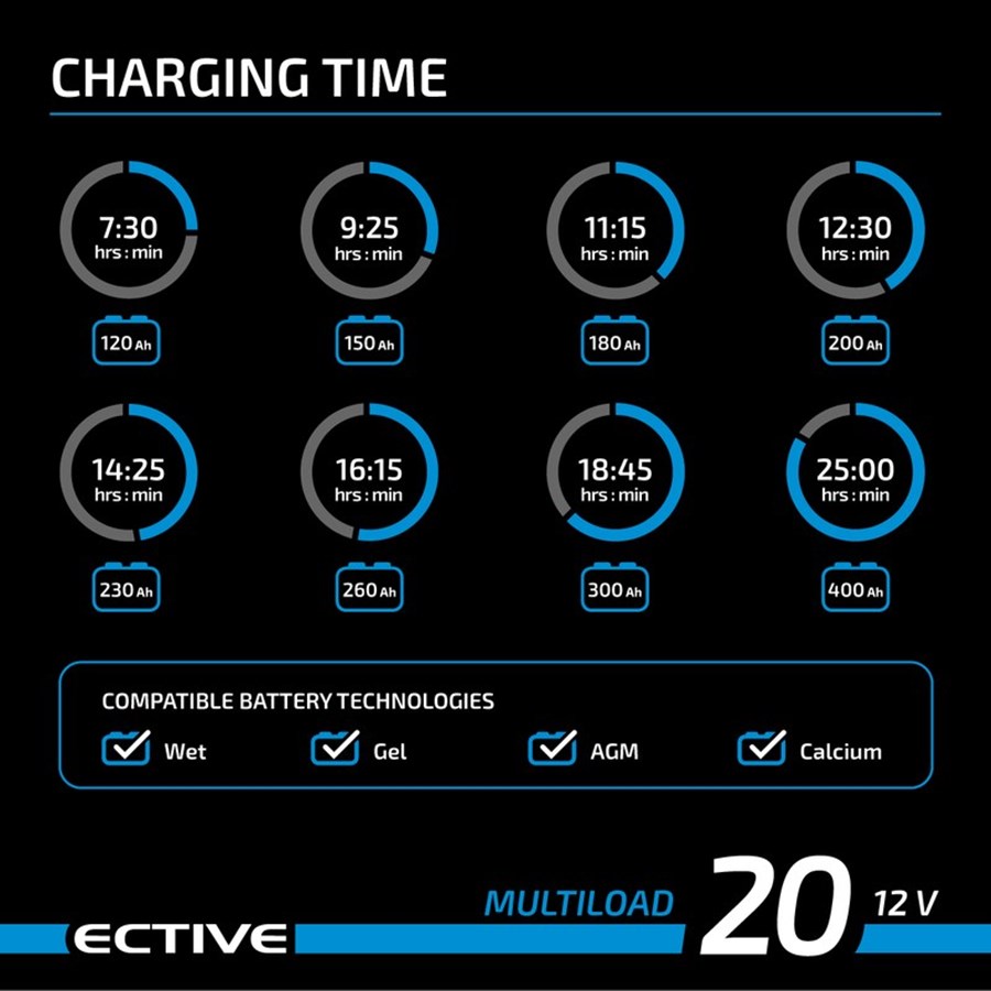 Cargador moderno para baterías húmedas, AGM, de gel o con un proceso de carga suave y totalmente automático en 8 etapas.