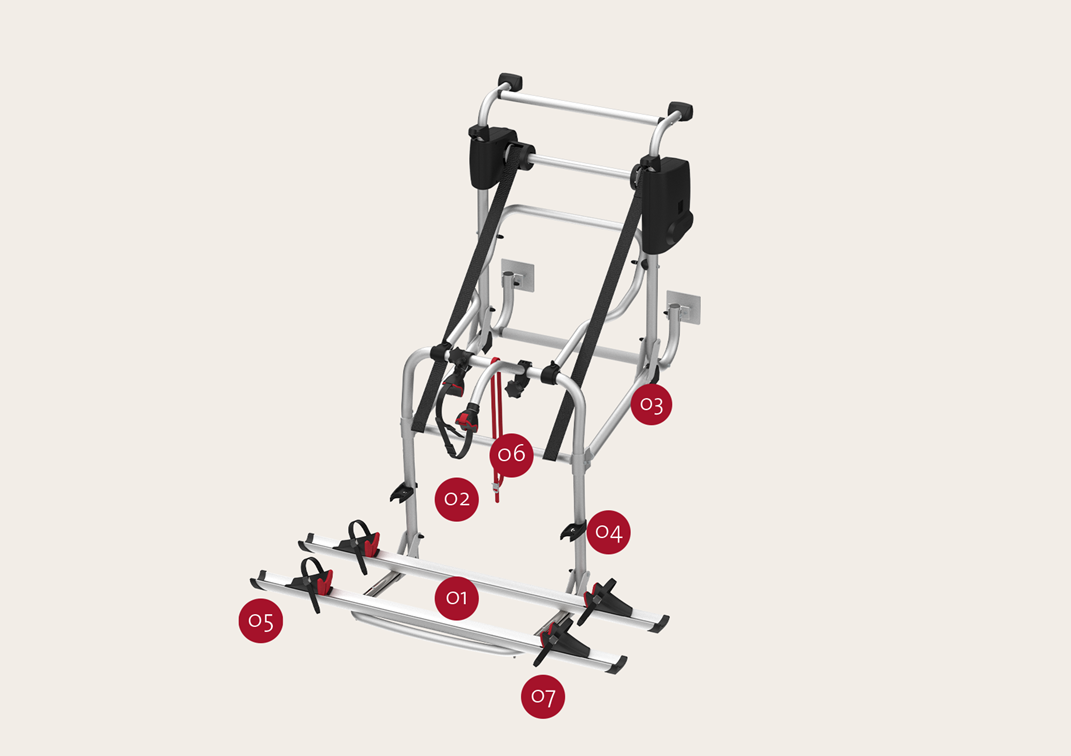 Carry-Bike motorizado para autocaravanas, el estante se baja 77 cm para cargar y descargar las bicicletas sin esfuerzo.