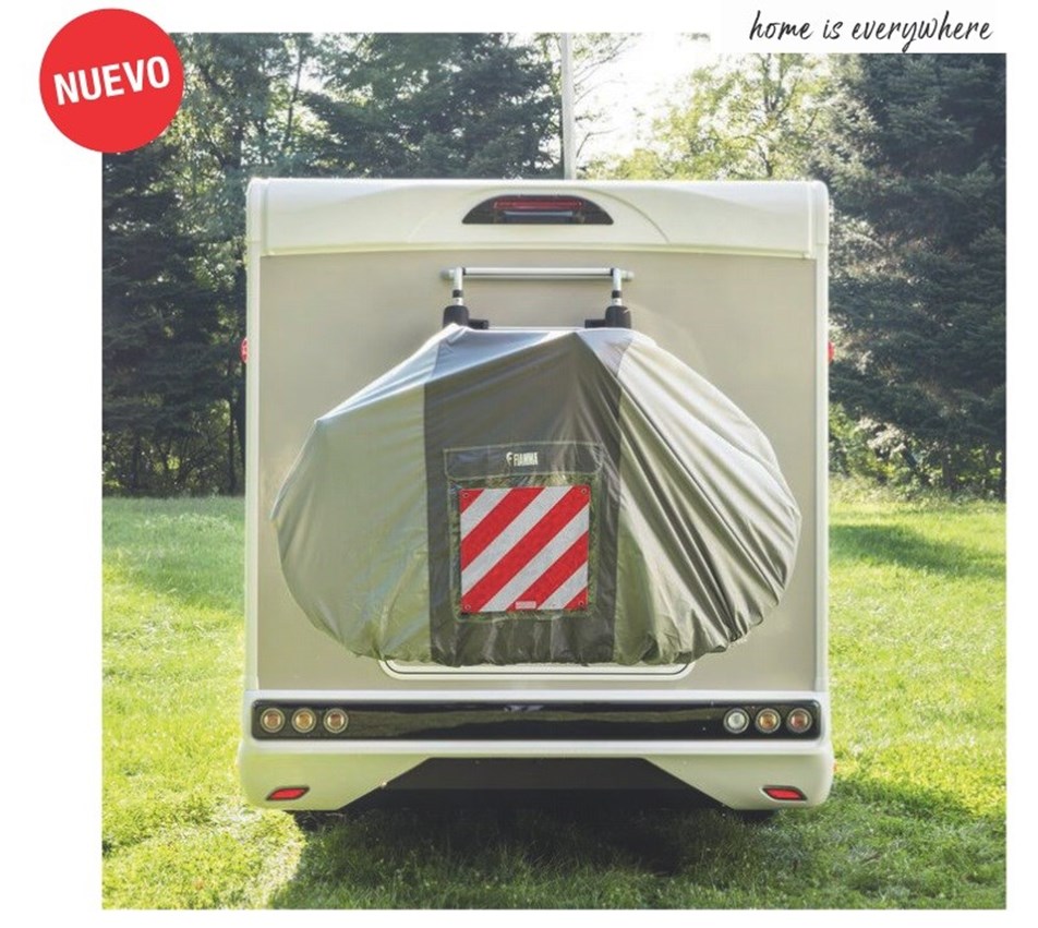 Específica para autocaravanas. En tejido poliéster 300D con soporte en poliuretano, máxima cobertura y resistencia a la intemperie. Se adapta a cualquier modelo de bicicleta gracias a su cierre mediante tensores con ganchos. Se suministra con un bolsillo transparente para panel de señalización de carga en voladizo. Funda de protección para portabicicletas FIAMMA
