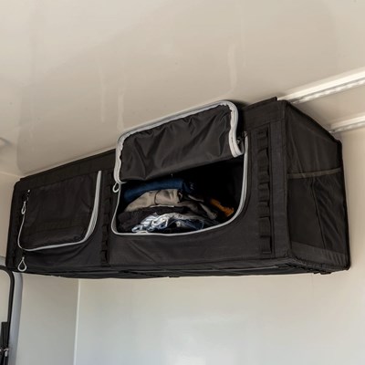 ¿No sabes dónde guardar todas tus cosas? Nuestra bolsa de almacenamiento es perfecta para ti. Crea espacio para todo lo que de otro modo estorbaría. Está diseñada específicamente para furgonetas o furgonetas con paredes rectas. Para su montaje, necesitarás rieles, como los de las aerolíneas, en la pared o el techo. La wallBOXX tiene dos compartimentos de almacenamiento con cremallera y una capacidad aproximada de 210 litros.