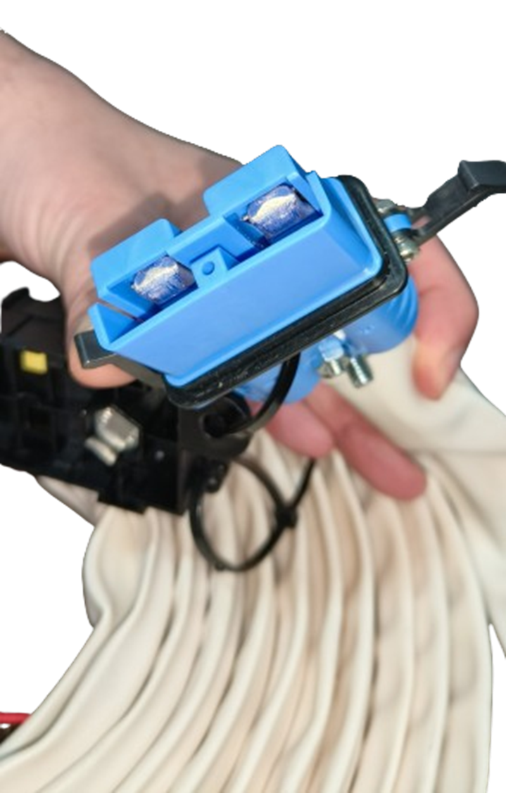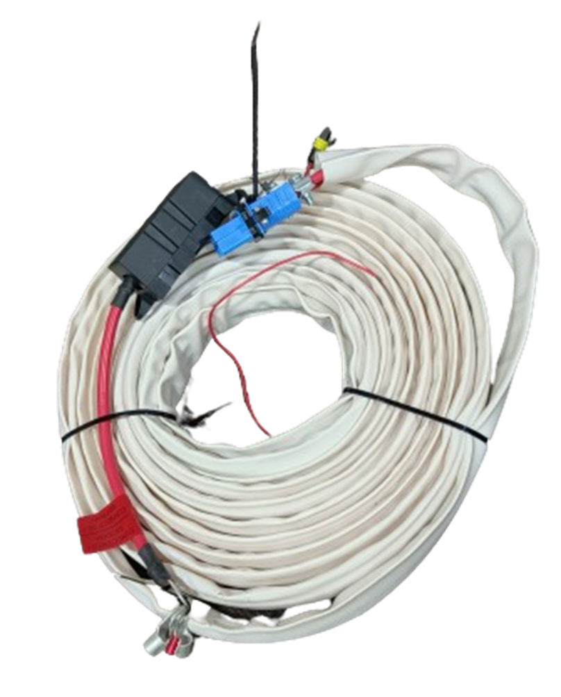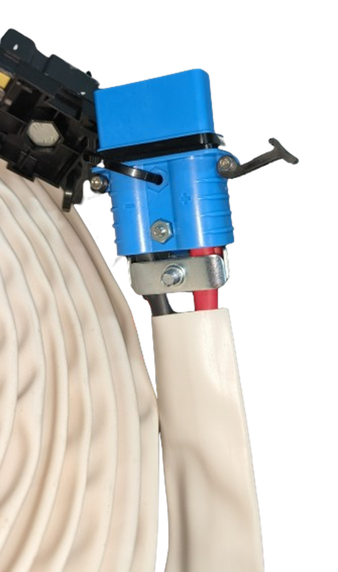 Cable de conexión compatible con OPENAIR 12V y RTA 2000 12V: Consta de conectores para rápida conexión en equipo y Baterías. Fusible de 100 A y portafusibles. Cable de señal de tensión de baterías para sistema de protección. Sección de cable 25 milímetros y una extensión total de 10 metros de largo. Todo ello enfundado en PVC de color blanco para extra de protección.