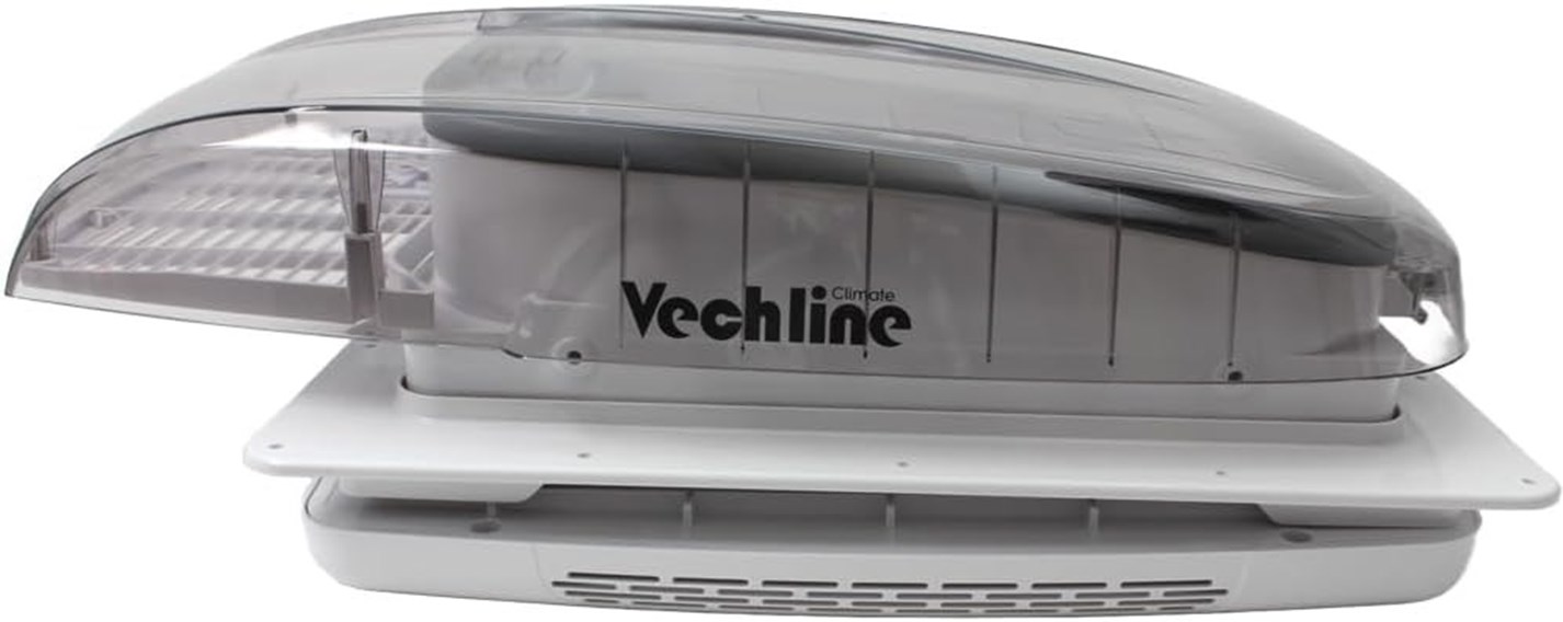 Claraboya de techo Vechline LUX de 12 V con campana de cristal transparente tintado, ventilador, marco interior con estor opaco, iluminación LED y mando a distancia por radio. Dimensiones aproximadas: :