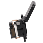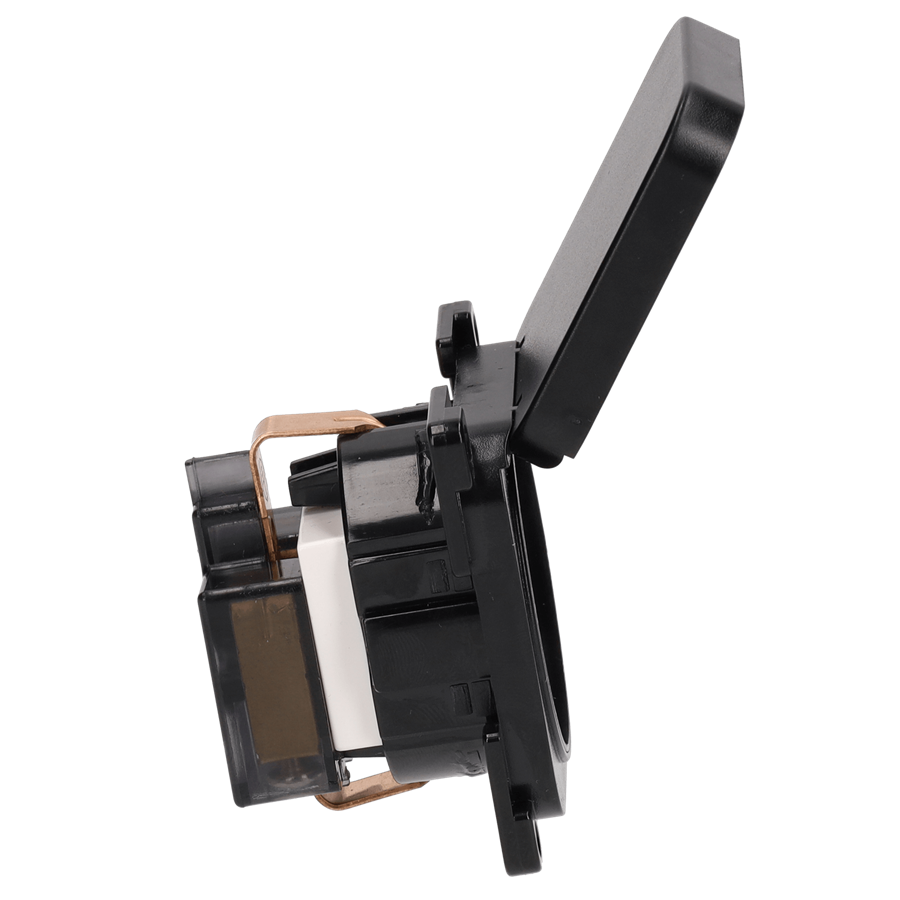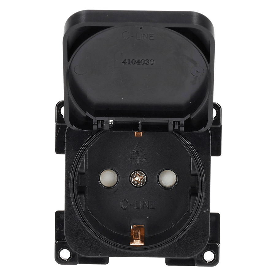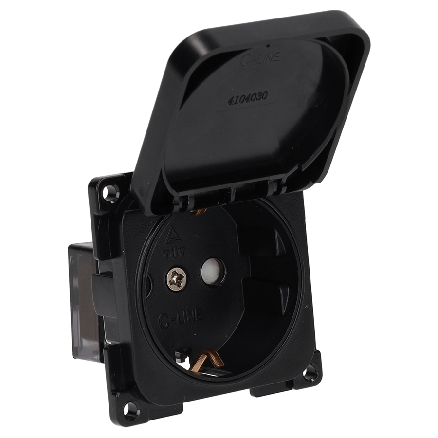 Nuestra última incorporación a la gama C-line: el enchufe C-line con tapa abatible. Este enchufe empotrado, disponible en color negro, es resistente a las salpicaduras y está equipado con protección infantil para mayor seguridad. Su elegante diseño combina a la perfección con otros elementos de la serie C-Line y con los marcos de cubierta de la serie Opal, ofreciendo estilo y funcionalidad.