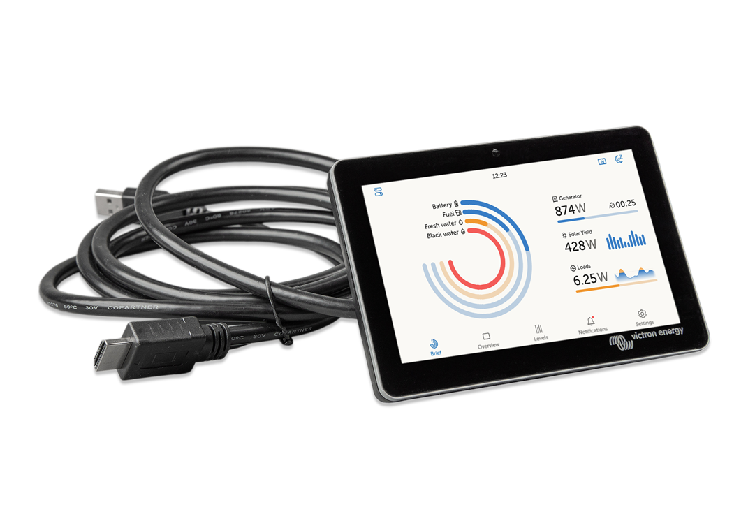 GX Touch 50 son pantallas accesorias para nuestro Cerbo GX. Las pantallas táctiles de cinco y siete pulgadas proporcionan un resumen instantáneo de su sistema y le permiten ajustar la configuración rápidamente. Conectadas simplemente con un cable al Cerbo GX, su diseño súper fino y resistente al agua, con posibilidad de montaje en la parte superior y fácil instalación, proporcionan una gran flexibilidad a la hora de crear un panel de control limpio y claro.