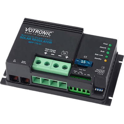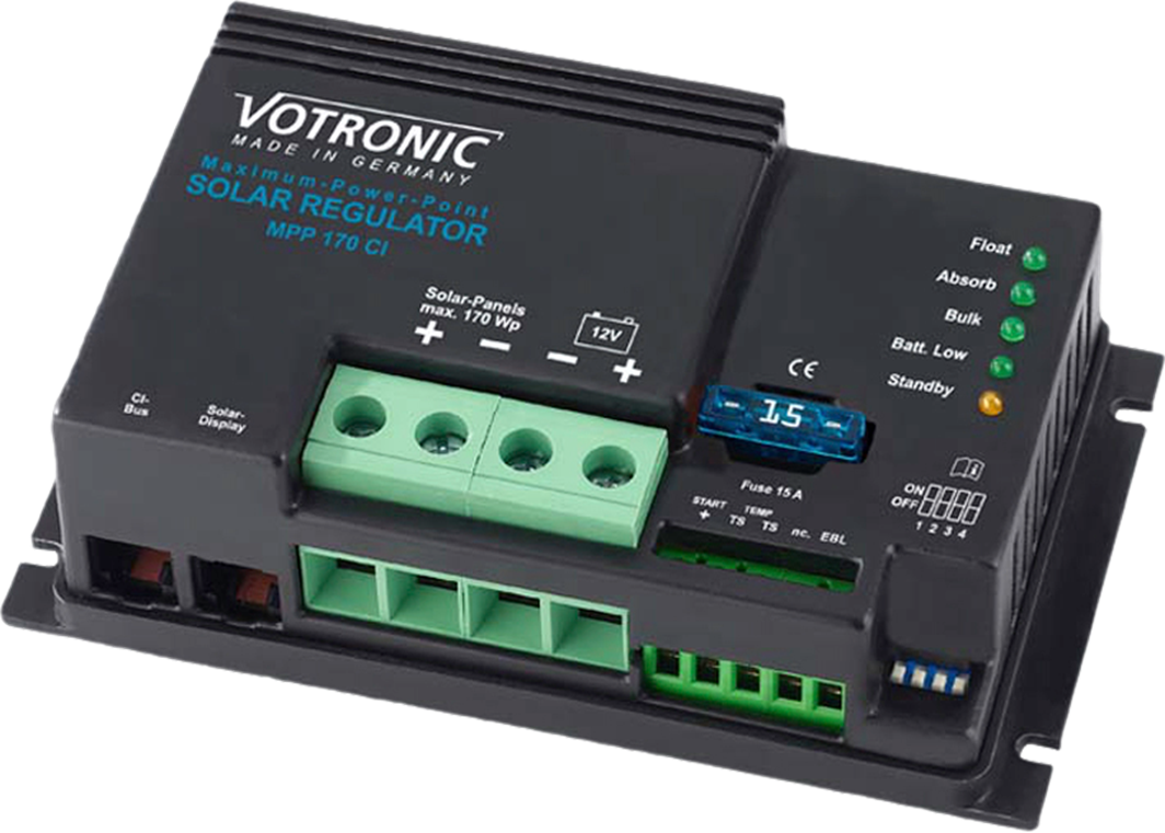 - Conectividad: Dispone de una conexión para el Votronic LCD Solar Computer S (Nº de pedido 1250) para monitorizar el sistema, así como conexión CI-Bus para sistemas de gestión a bordo.