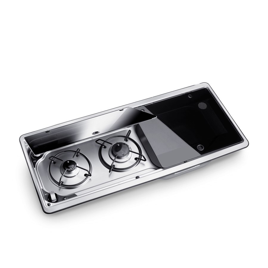 Combinación de placa de cocina de dos quemadores y fregadero con tapa de cristal, 760 x 325 mm, encendido de 12 V