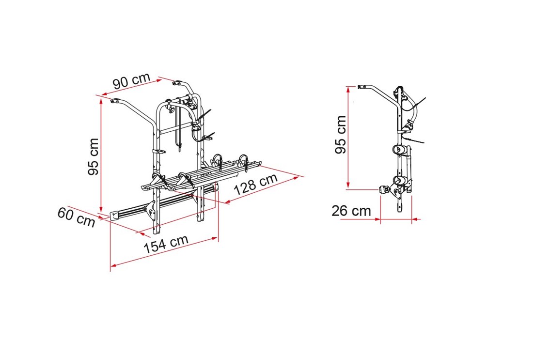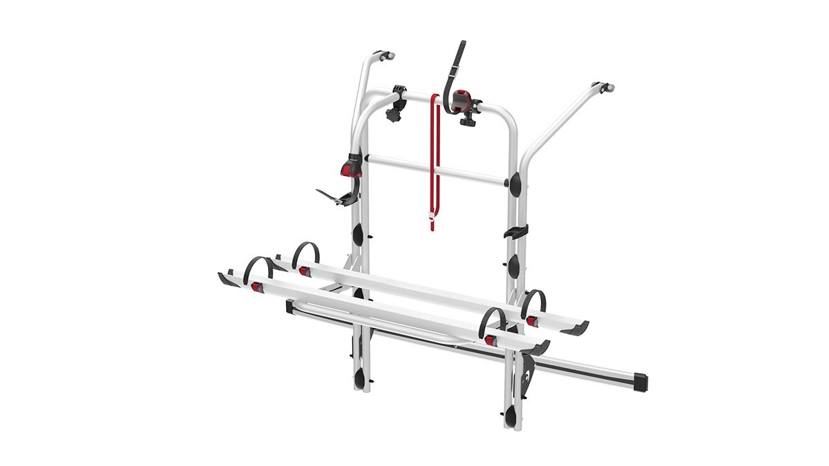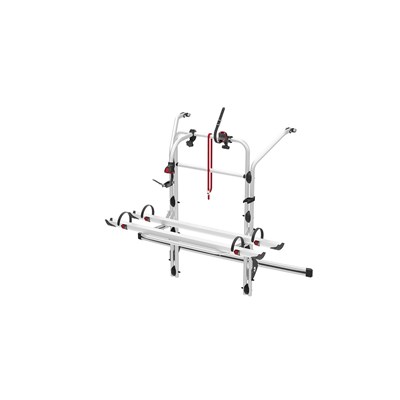 Suministrado de serie con dos canalinas, puede llevar hasta 4 bicis / 2 E-Bike. La versión Premium permite el montaje de la repisa en dos posiciones, una estándar y una rebajada para facilitar la carga de las bicis. En la versión rebajada es necesario el uso de la barra portamatrícula, con grupo de luces Licence Plate Carrier