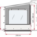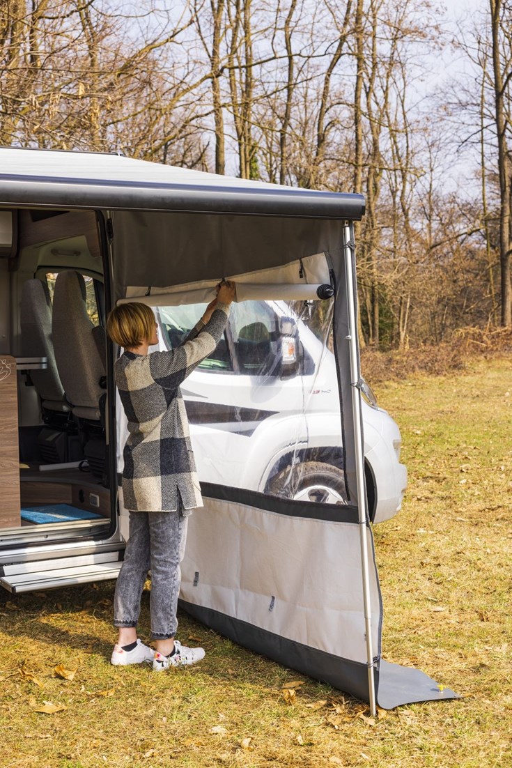 Cierre lateral vinílico con gran vidriera Crystal provista de oscurecedor enrollable y faldón gris hasta el suelo; anti-moho, anti-UV y lavable.