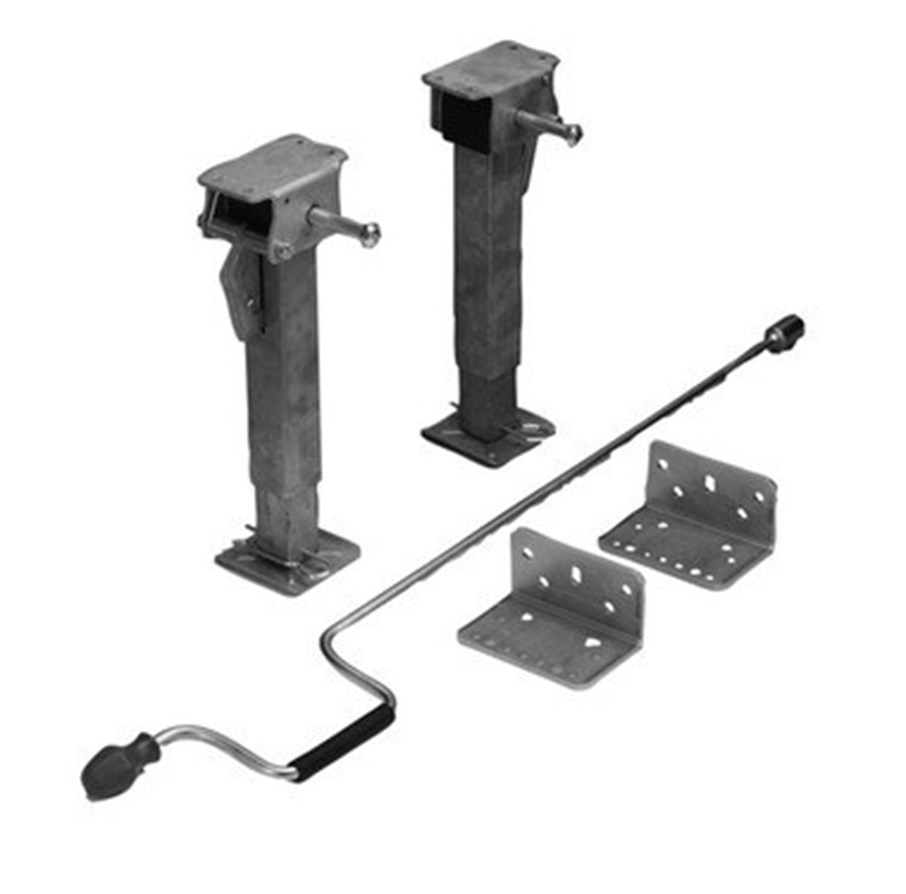 Gatos estabilizadores galvanizados robustos con bloqueo de trinquete y control por palanca. Fijación bajo el chasis de la autocaravana. Fuerza 500 kg.
