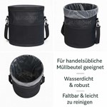 Apta para bolsas de basura estándar de 20 litros y equipada con una resistente correa de transporte y un mosquetón, se puede fijar de forma flexible en el vehículo, en la furgoneta o al aire libre, por ejemplo, en la puerta, en la parte trasera o en la silla de camping.