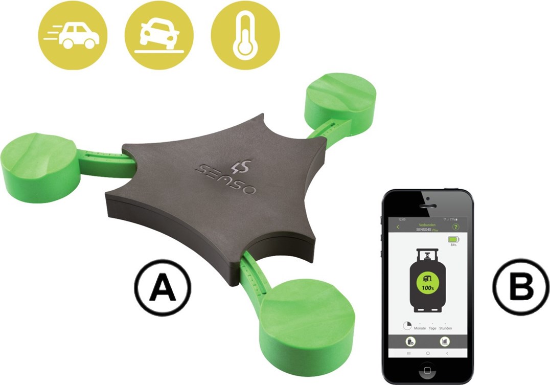El Senso4s PLUS es un indicador de nivel digital para botellas de gas. El dispositivo de pesaje mide el peso de la botella de gas y transmite este valor a la aplicación a través de Bluetooth. Esta calcula el contenido actual de la botella de gas y lo transmite a su dispositivo móvil.