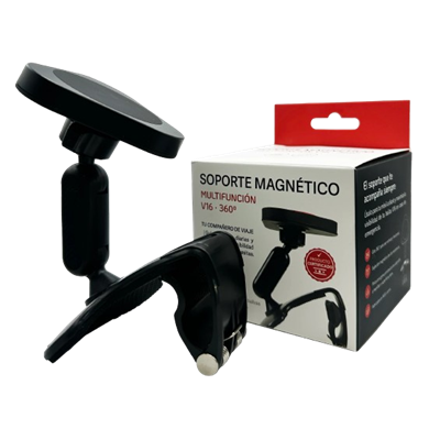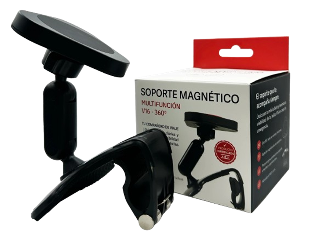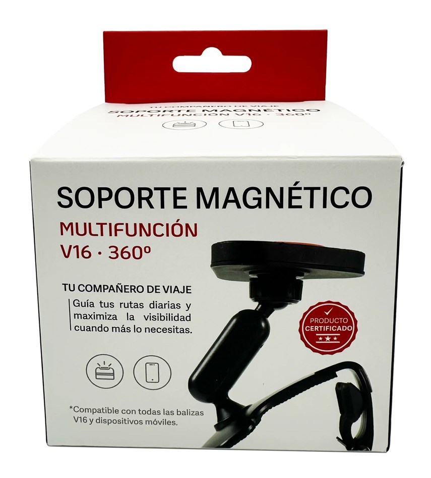 El Soporte Multifuncional V16 es un dispositivo certificado que mejora la estabilidad y visibilidad de cualquier baliza V16 con base magnética, especialmente en situaciones de emergencia donde la correcta orientación de la luz es clave. Puede fijarse de manera segura en múltiples superficies gracias a su pinza de alta resistencia y su cabezal magnético recubierto de goma antideslizante.