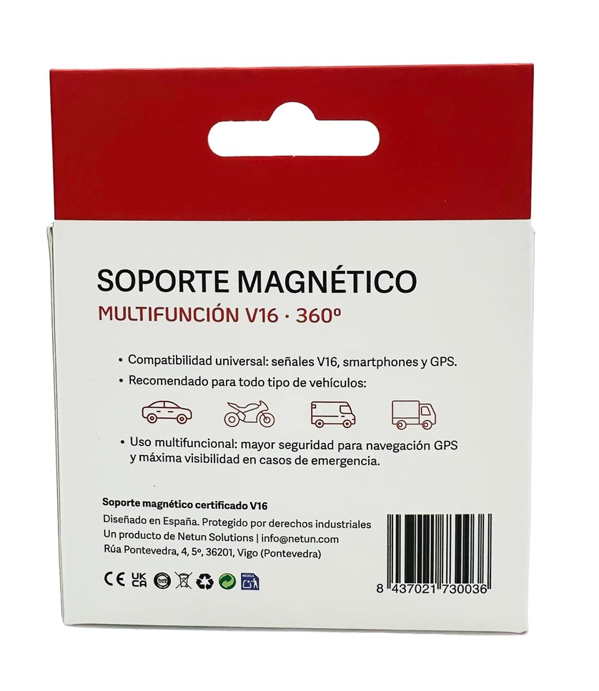 - Sí. Es compatible con todas las balizas V16 con base magnética del mercado. Si la adherencia no fuera suficiente, incluye un disco metálico adhesivo para mejorar la sujeción.