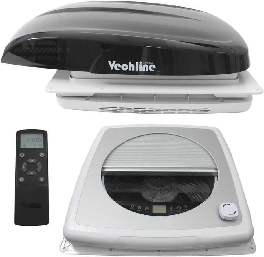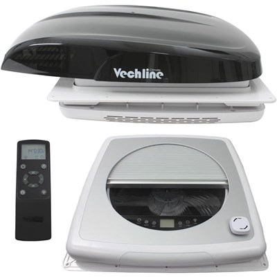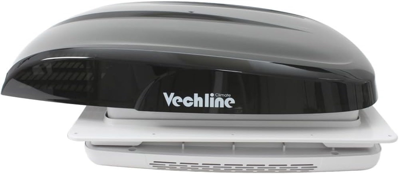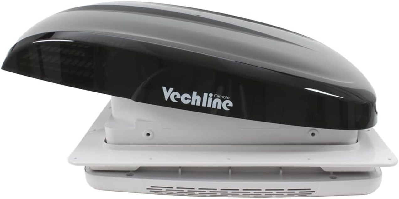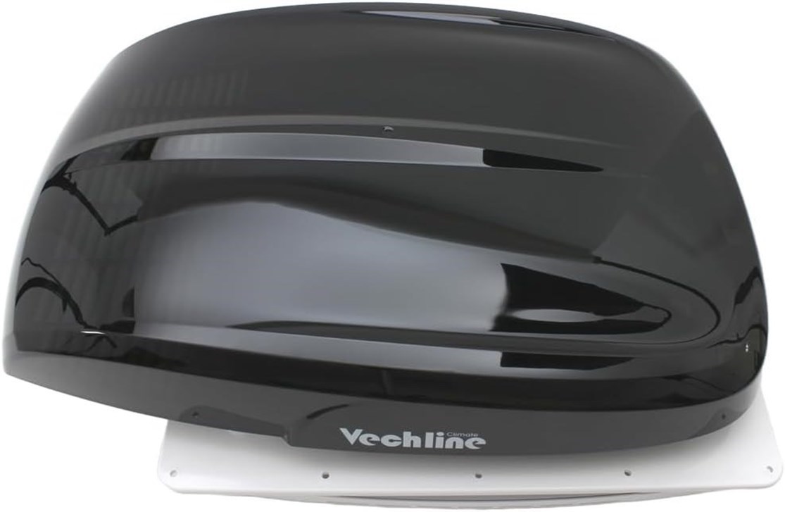 Claraboya de techo Vechline LUX de 12 V con campana de cristal transparente tintado en negro, ventilador, marco interior con estor opaco, iluminación LED y mando a distancia por radio. Dimensiones aproximadas: :