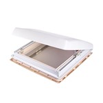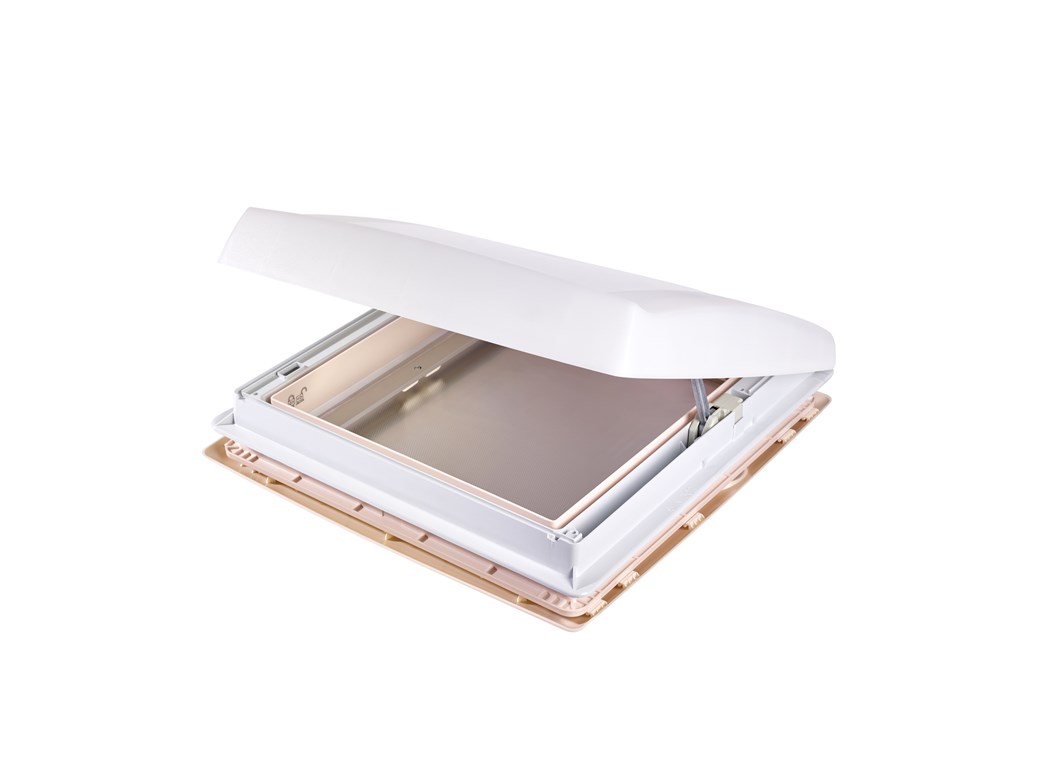 Claraboya THULE Vent con ventilación permanente. La fijación se realiza apretando la tapa interior sobre la parte exterior. Apertura mediante un compás lateral controlado por una mariposa. Con mosquitera y persiana. Se puede montar en techos con un grosor de 25 a 40 mm y en recortes de 400 x 400 mm.