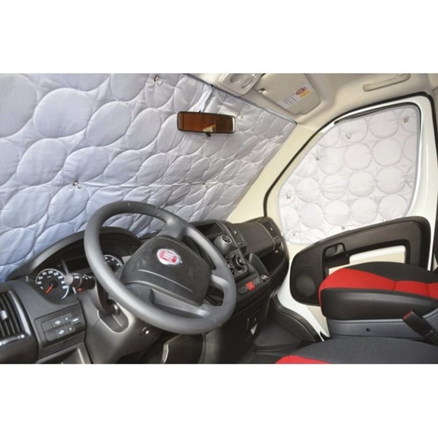 El kit de cabina consta de tres partes: 1 para el parabrisas y 2 para las ventanas de las puertas delanteras. Compuesta por 9 capas de materiales sintéticos de alta calidad, proporcionan un excelente aislamiento contra el calor y el frío y ralentizan la condensación. Se aplican a la superficie de los cristales, haciendo que sean totalmente opacos. El salpicadero queda protegido de los efectos no deseados de los rayos del sol. Fácil montaje y desmontaje gracias a sus ventosas específicas. La cortina, al ubicarse en el interior del vehículo, se mantiene en condiciones impecables independientemente del clima y se puede almacenar con facilidad después de su uso.